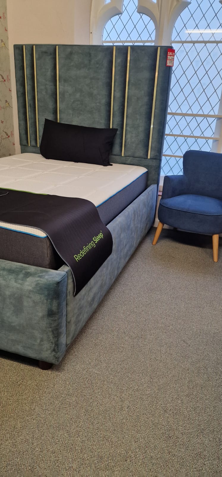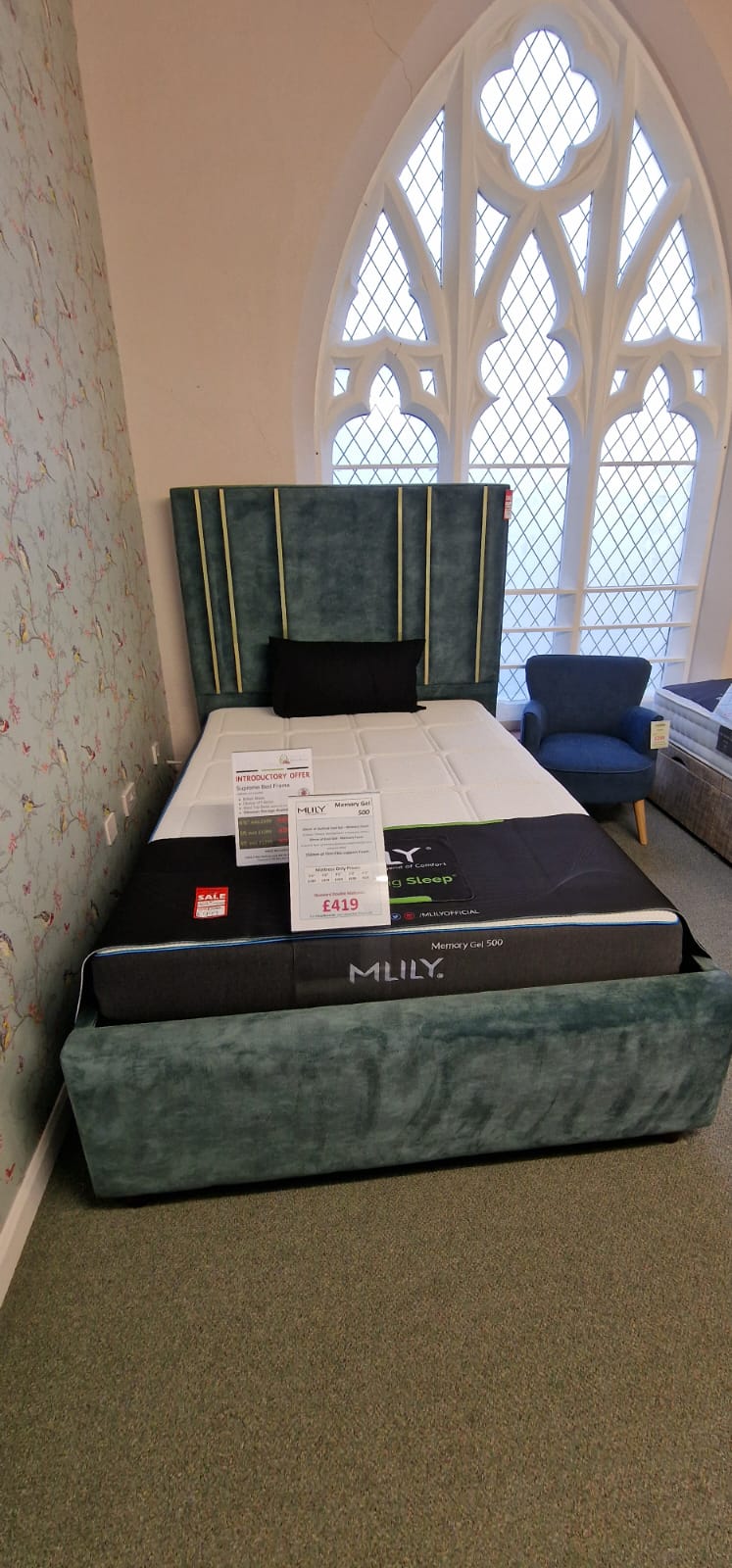EX DISPLAY 4'6" BED OFFER - Conrad Fabric Bed Frame & Foam Mattress - Memory Gel 200